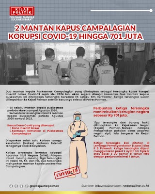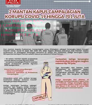 Lebih lanjut dalam unggahan @kilaspolitikpolman disertai unggahan flayer yang menginformasikan Kasus korupsi yang melibatkan dua mantan kepala Puskesmas Campalagian dan seorang anggota tim verifikator menjadi perhatian publik. Tersangka pertama, SR, menjabat sebagai kepala puskesmas pada periode Maret hingga Agustus 2020. Sementara itu, tersangka kedua merupakan kepala puskesmas yang bertugas pada periode Agustus 2020 hingga 2023. Selain kedua mantan kepala puskesmas tersebut, seorang anggota tim verifikator, ES, juga turut ditetapkan sebagai tersangka.