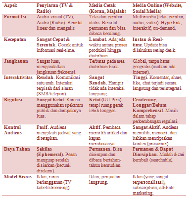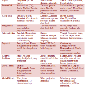 3. Dari Segi Hubungan dengan Audiens: Penyiaran dan media cetak cenderung top-down (dari institusi ke massa). Sebaliknya, media online bersifat dialogis dan partisipatif, mengaburkan batas antara produser dan konsumen konten.
