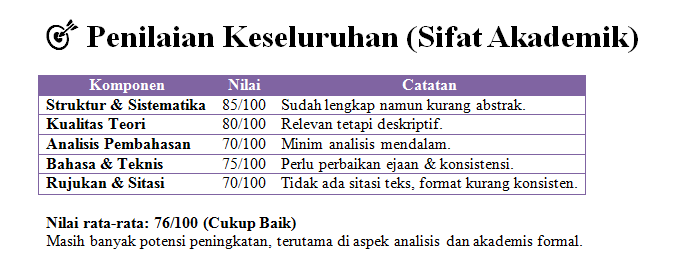 Makalah bersifat terlalu deskriptif; minim argumentasi kritis yang menunjukkan pemahaman tingkat akademik.
